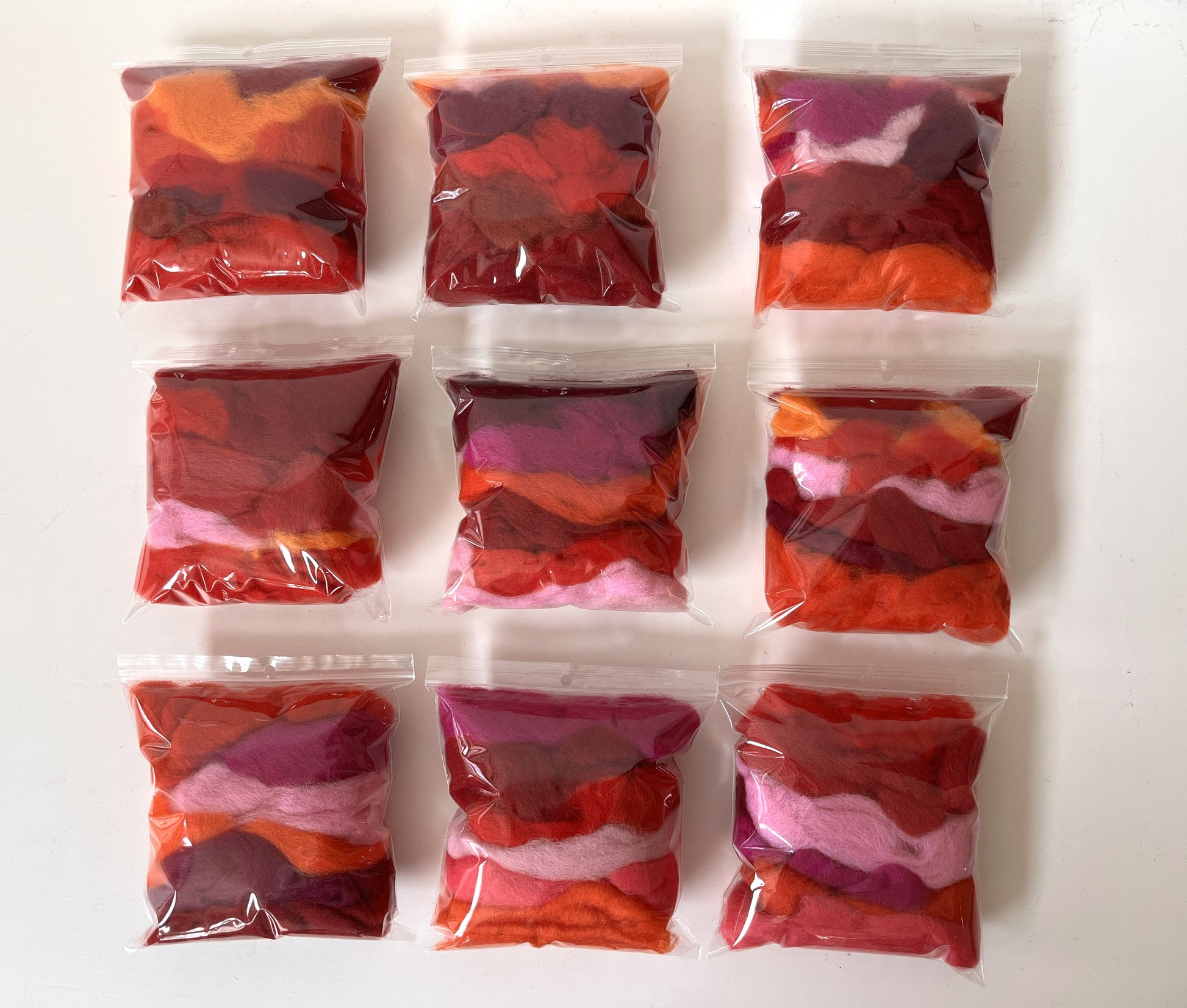 100% Corriedale wool roving in a color wave that includes reds, oranges, pinks and burgundy.